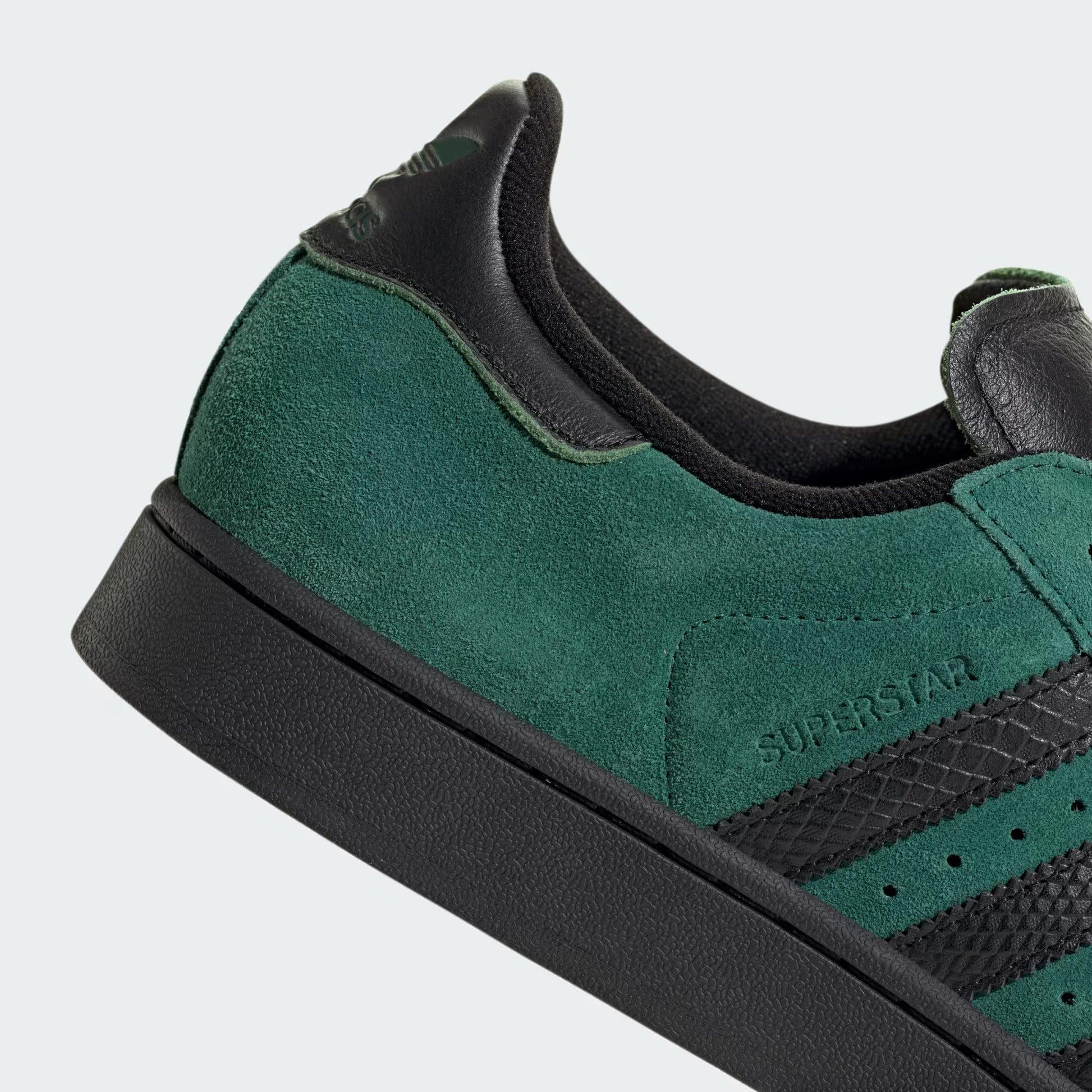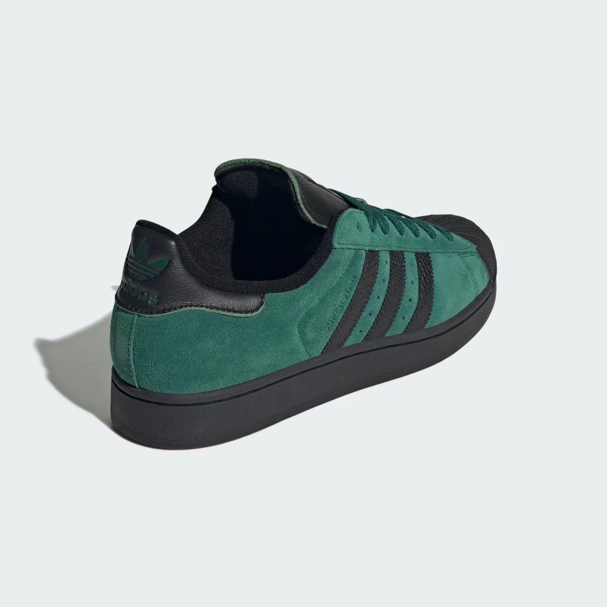 La icónica silueta Superstar ahora en verde esmeralda vibrante con detalles negros y textura reptil en las tres barras. Upper de gamuza premium que eleva el legendario diseño a otro nivel de sofisticación. La punta de concha característica mantiene la esencia, el colorway audaz redefine las reglas. No es solo verde. Es personalidad. Es diferenciarte cuando todos usan lo mismo. Comodidad legendaria con estilo que no pasa desapercibido.